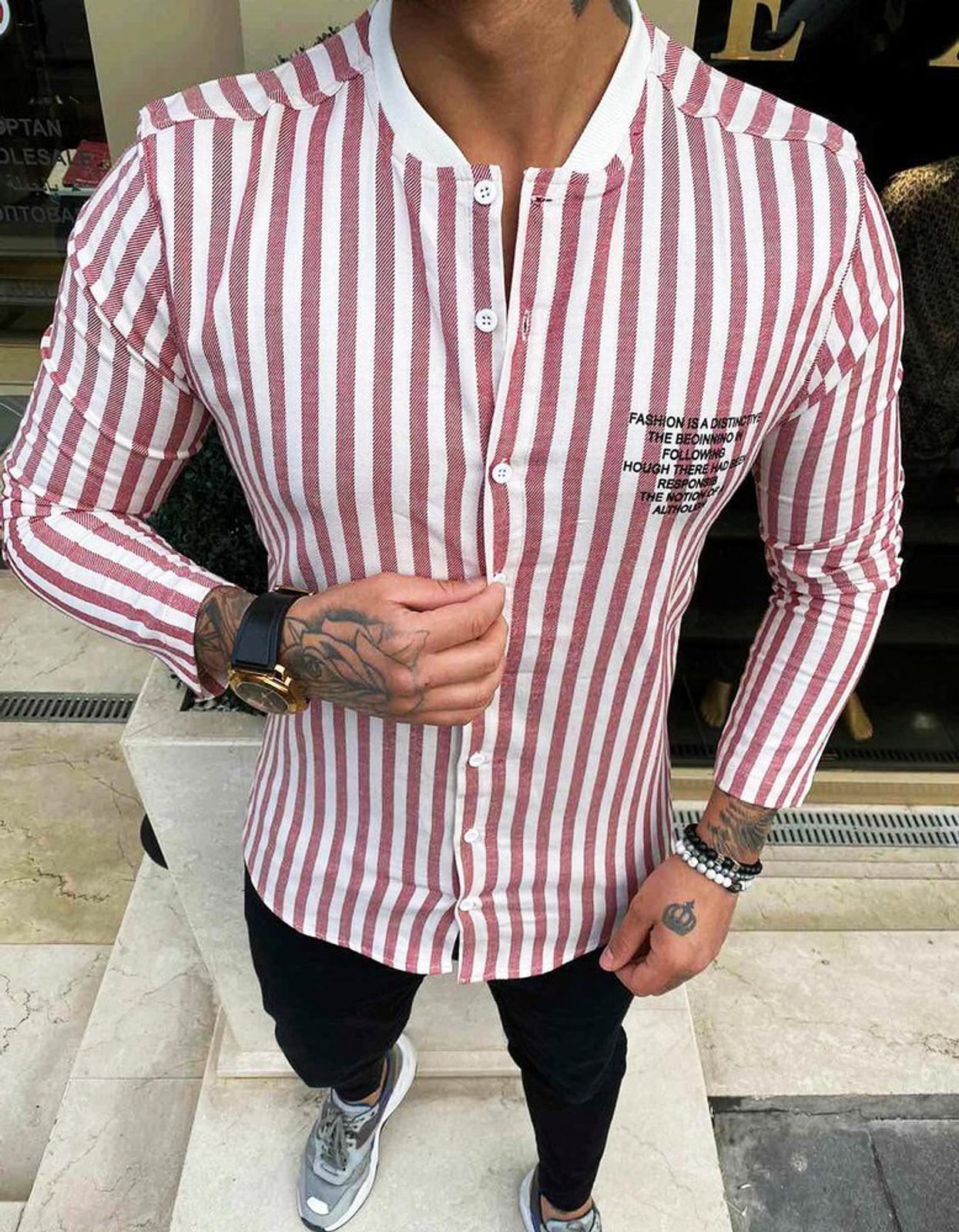 Pruhovaná košeľa s dlhým rukávom disponuje zapínaním pomocou gombíkov. Moderná košeľa má stand-up golierik. Model je zaujímavý vďaka štýlovej potlači na hrudi. Košeľa má zaobelný lem, pohodlný a rovný strih.