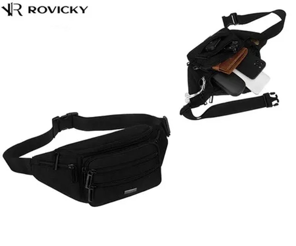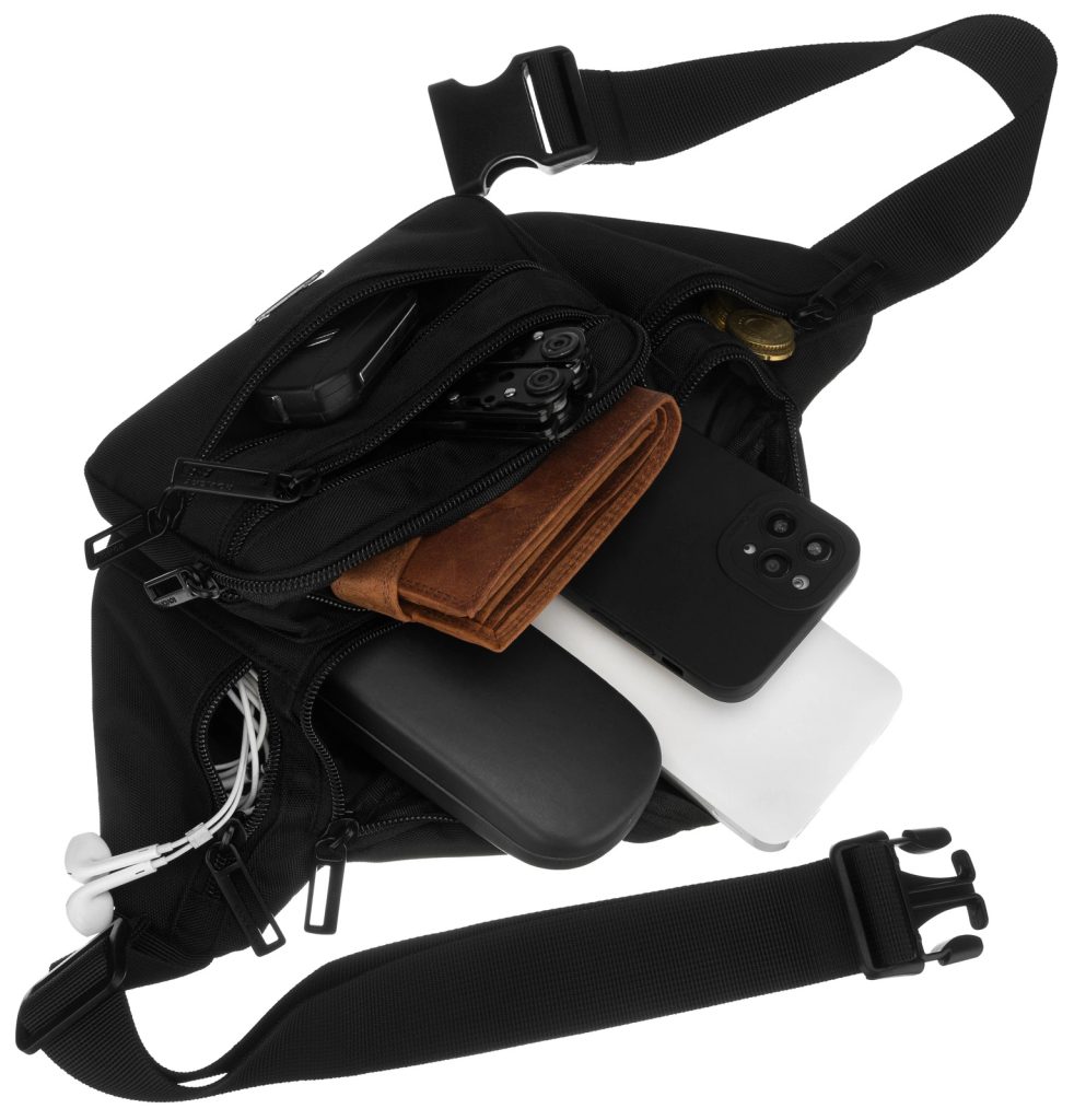 Moderná čierna pánska ľadvinka je ideálna na každodenné nosenie. Model má hlavnú priehradku so zapínaním na zips. Extra priehradky vpredu a vzadu sa zapínajú na zips. Tento model je ideálny na nosenie okolo pásu. Bedrový pás je možné nastaviť podľa potreby.