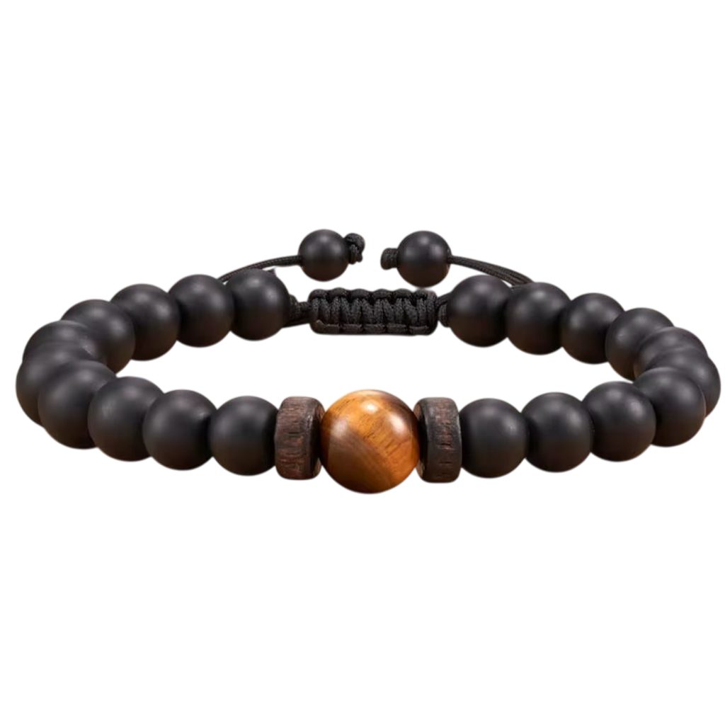 Čierny korálkový náramok, ktorý je oživený kontrastnou korálkou uprostred náramku. . Nastaviteľná veľkosť za pomoci sťahovacích šnúrok.