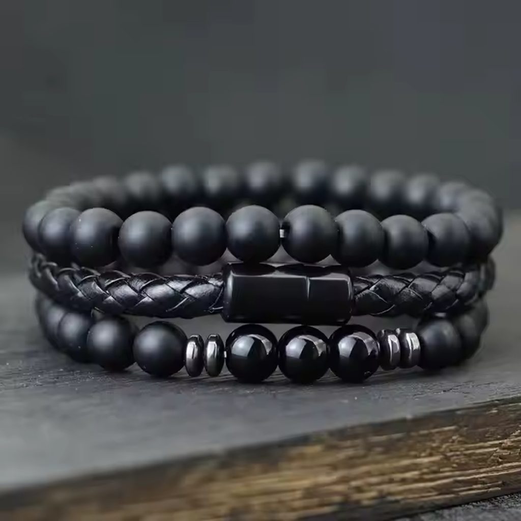 Originálny čierny pánsky náramok. Zaujímavá kombinácia troch pánskych náramkov spojených do jedného. Súčasťou tohto setu náramku je kožený, korálkový a kamienkový náramok. Každý z nich je v jedinečnom dizajnovom prevedení.