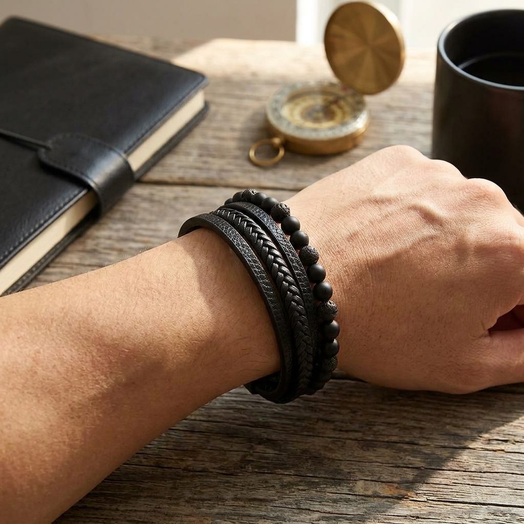 Originálna zostava pánskych náramkov v jednom. Tento štýlový pánsky náramok zaujme svojou kombináciou kožených náramkov doplnených o korálkový náramok. Jednoduché zapínanie.