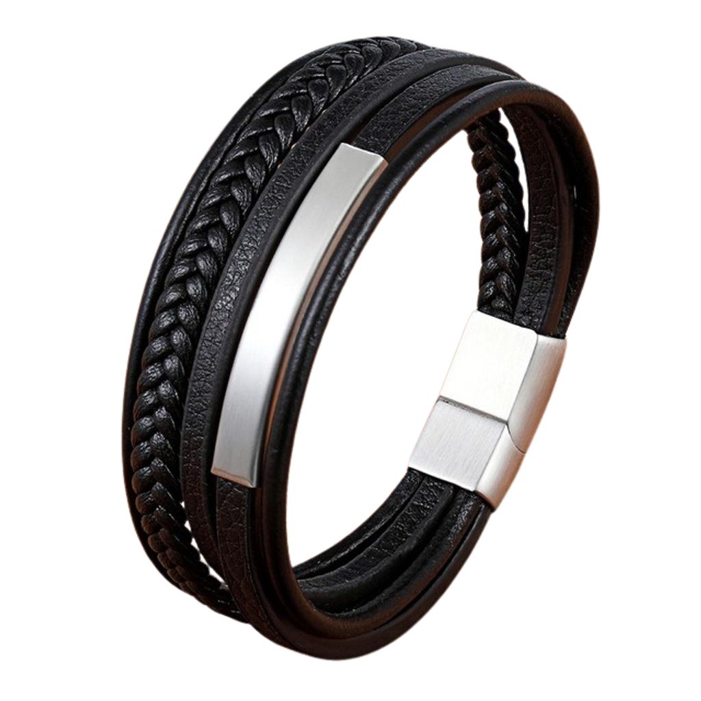 Jana Feherova, 18.12.2025Trendy kožený náramok je kombináciou modernej elegancie a mestského minimalizmu. Čierna viacvrstvová konštrukcia z kvalitnej eko kože spája hladké a pletené pásy do jedného harmonického celku, ktorý skvele doplní každodenný outfit aj formálnejší vzhľad. Dizajn dopĺňajú matné oceľové prvky z nehrdzavejúcej ocele, ktoré dodávajú náramku decentný, no výrazný charakter. Magnetické zapínanie zabezpečuje pohodlné nosenie a bezpečné uchytenie na zápästí. Vhodný na každodenné nosenie alebo ako darček