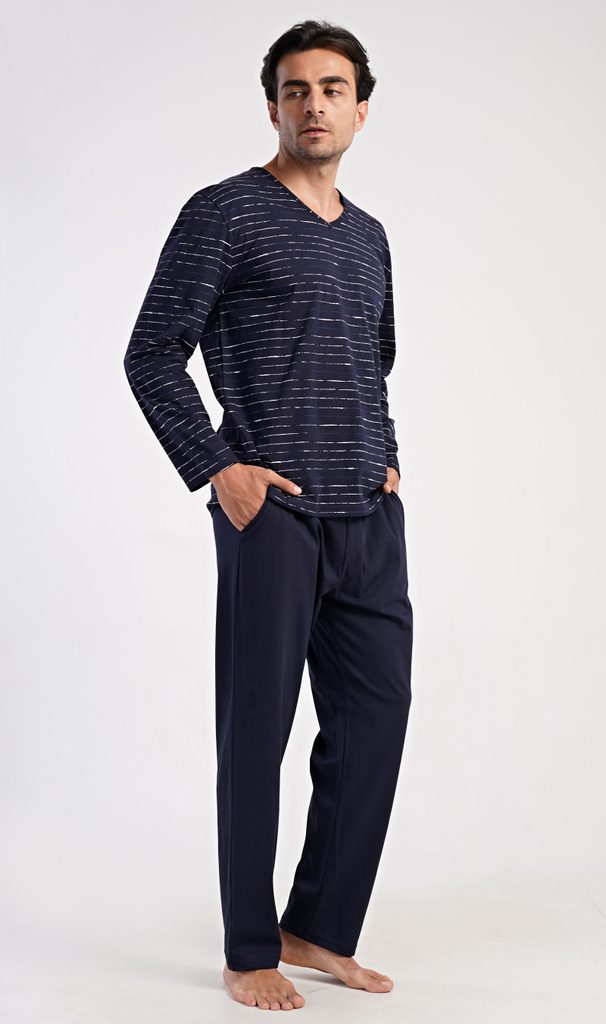 Pyžamo je vyrobené z bavlny. Úplet je vhodný pre všetkých, ktorí hľadajú prírodné materiály. Pyžamo z tohto materiálu je vhodné pre každodenné nosenie. Komplet pozostáva z pásikavého trička s V-výstrihom a jednofarebných nohavíc. Nohavice s vreckami majú v páse gumu a šnúrku na stiahnutie.