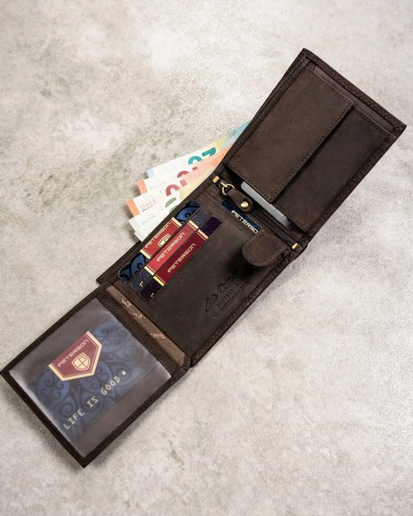 Peňaženka a kožená kľúčenka sú dodávané v praktickej krabičke.