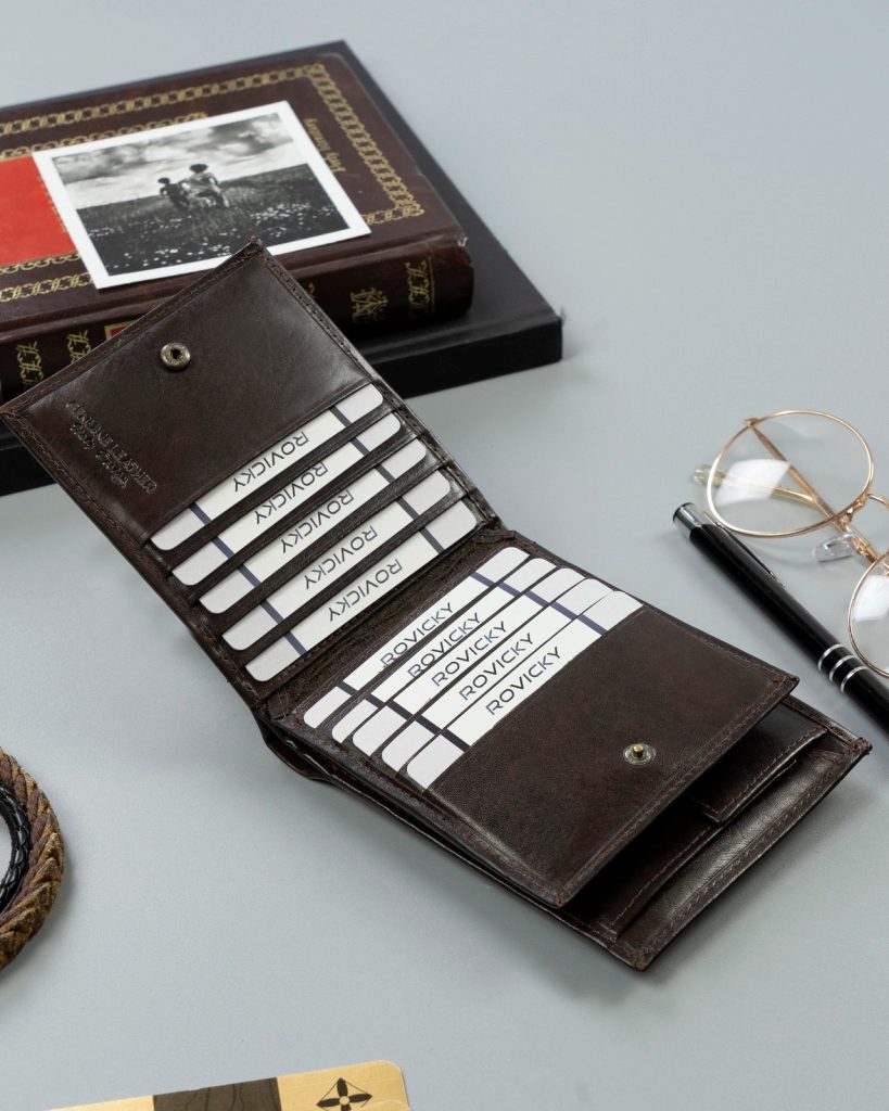 Klasická kožená pánska peňaženka orientovaná na šírku vyrobená z kvalitného materiálu. Peňaženka v trendy dizajne disponuje dostatočným úložným priestorom. Súčasťou peňaženky sú priehradky na bankovky, vizitky, kreditné karty, mincovník a RFID ochrana.