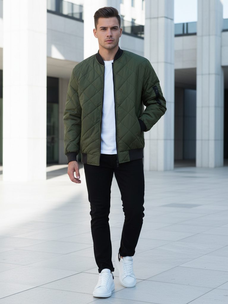 Zelená bomber bunda so zapínaním na zips je vhodná na bežné nosenie v období jar/jeseň. Súčasťou bundy sú dve vonkajšie vrecká, jedno vnútorné a extra vrecko na rukáve. Spodná časť i rukávy sú ukončené lemom. Vo vnútornej časti sa nachádza podšívka. Prešívaná bunda sa ľahko kombinuje k rifliam a k jednoduchému tričku.