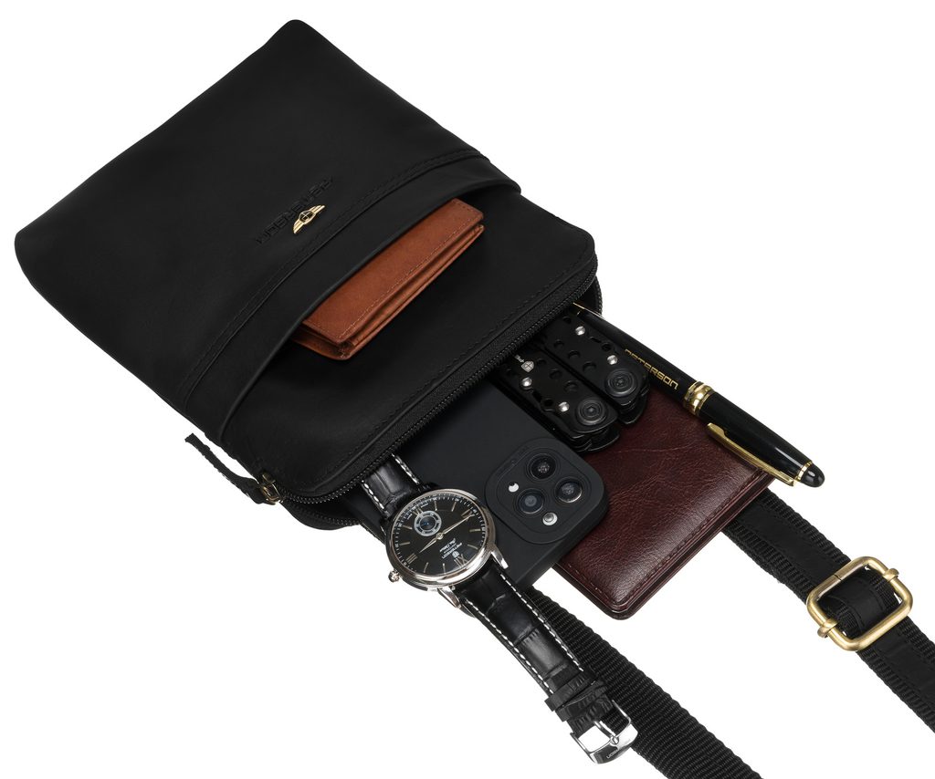 Moderná čierna pánska taška cez plece je vyrobená z kvalitného koženého materiálu. Taška obsahuje praktické vrecká a množstvo úložného priestoru.