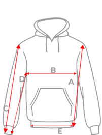 | VEĽKOSŤ MIKINY | CELKOVÁ DĹŽKA A | ŠÍRKA PRODUKTU B | VONKAJŠIA DĹŽKA C | VNÚTORNÁ DĹŽKA D | SPODNÁ ŠÍRKA E |
