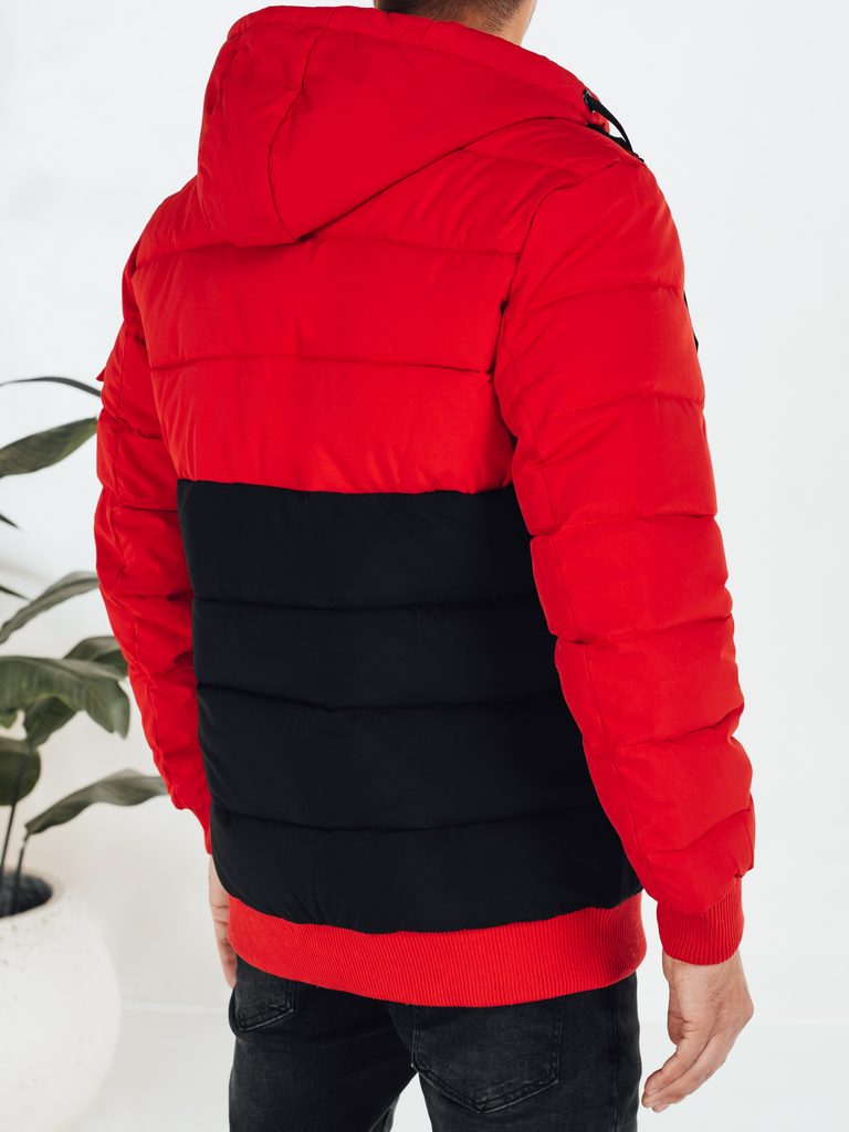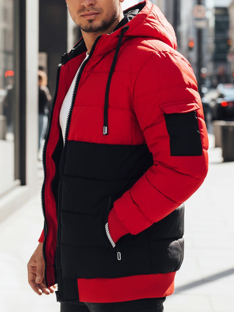 Pánska zimná bunda s kapucňou v červeno-čiernom prevedení